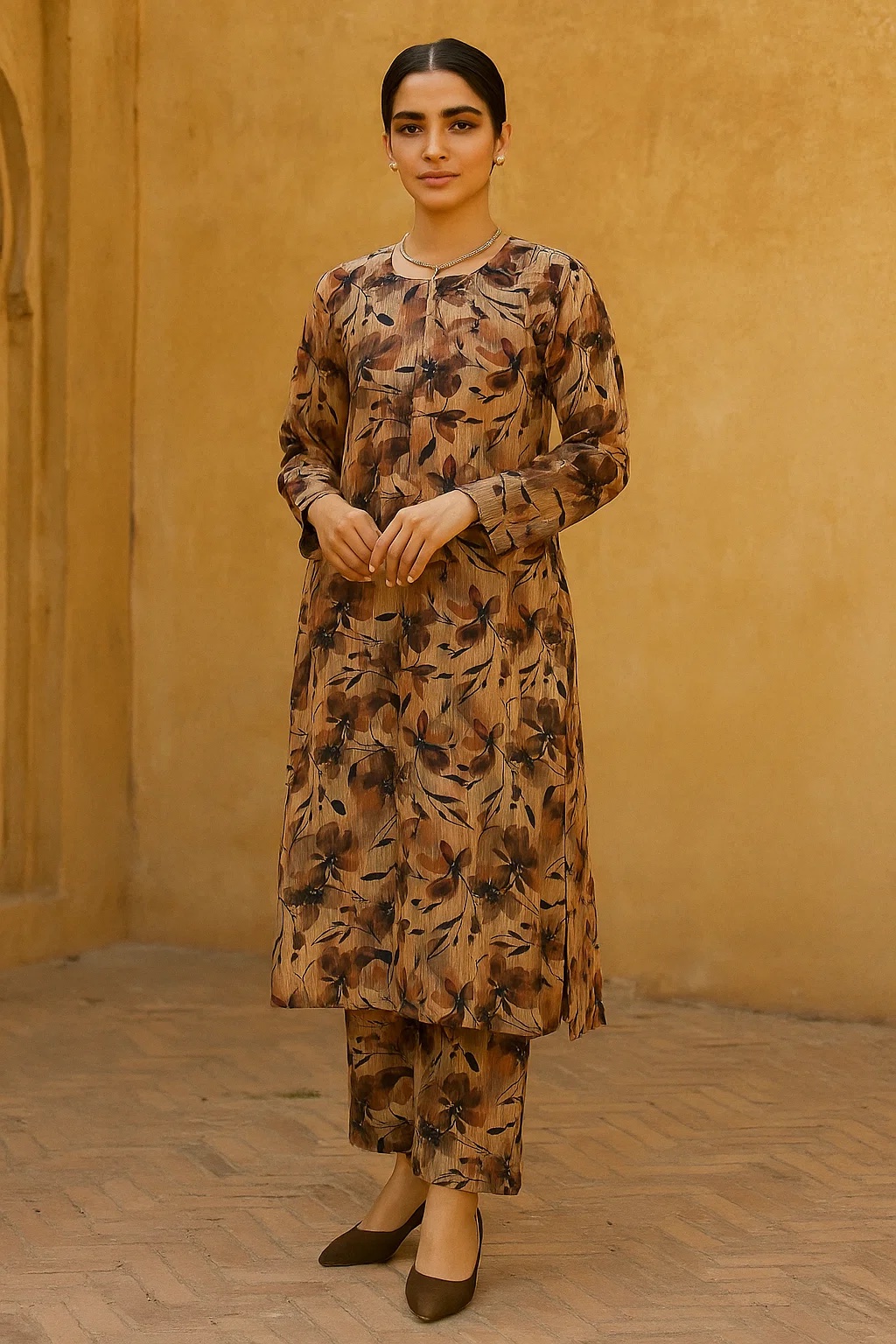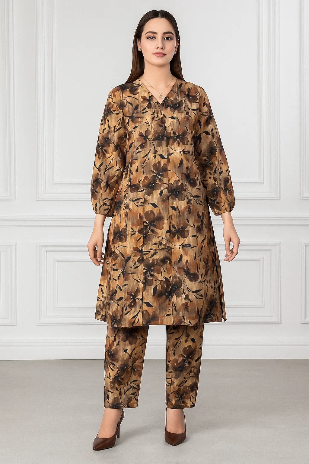 Serve earthy, elegant vibes with the Cocoa Bloom set. This rich brown co-ord features a sharp black leafy print on soft, breathable lawn for a look that’s both chic and comfortable.