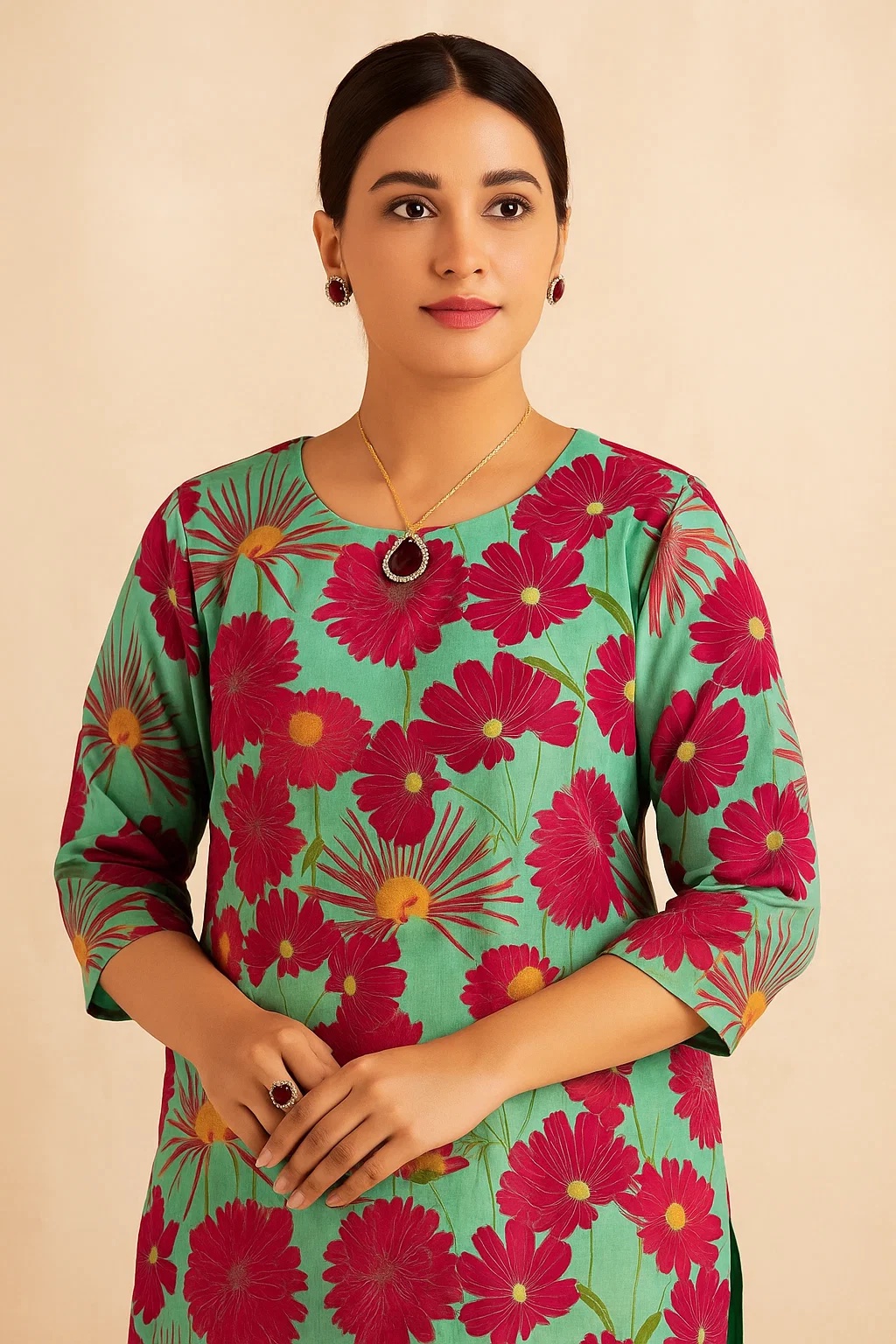 A beautiful fusion of vibrant turquoise and rich dark pink in an all-over floral print. This lightweight, breathable lawn co-ord set is the epitome of effortless, flirty style.